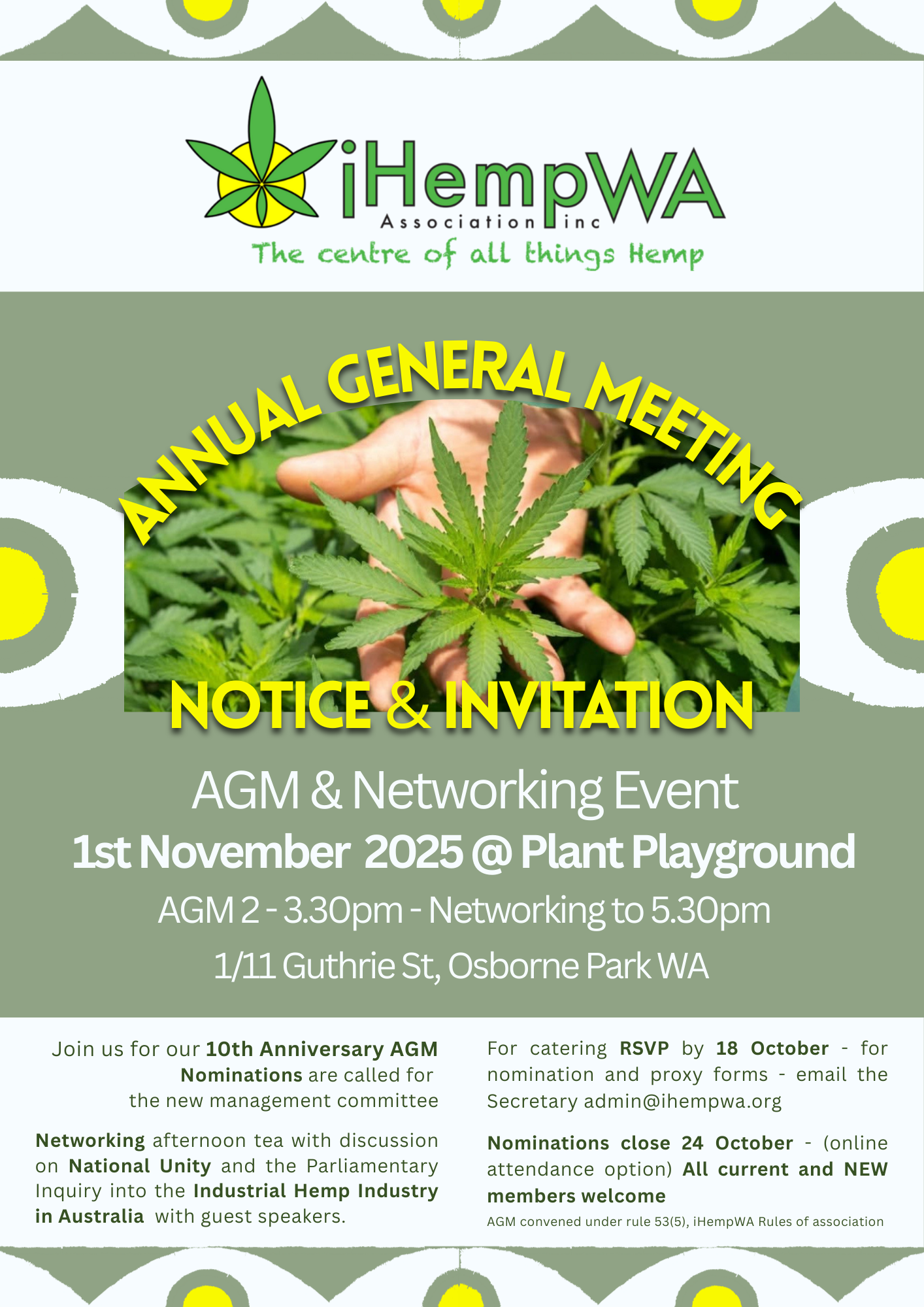 Opportunity to get involved: Work with wonderful women; Georgina Wilkinson of MR Hemp Co and MR Hemp Processing, the last remaining founding Member of iHempWA and Sharlene Mavor, Medical Cannabis Research Australia. New energy joining the committee; AMRShire Cr Melissa D’Ath, entrepreneur Re-Tyre Shoes and Sasha Lai, Plant Playground. Be the change you want to see, send Expressions of Interest to the secretary: admin@ihempwa.org